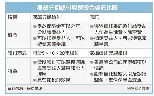 為顧及保險金「安全」,壽險公司推出身故保險金分期給付,避免一次給付保險金被亂花或者不當挪用,而「保險金信託」指定特定的用途,也具有同樣的效果。