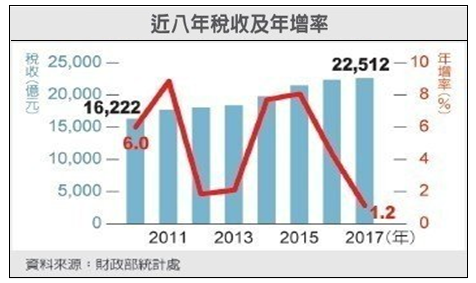 比較近年的賦稅收入,2010年全國賦稅收入為1.6兆餘元,此後一路成長,2011年受惠景氣回升,尤其所得稅稅收大幅成長,成長8.8%、進帳1,424億元;自2015年起,稅收更突破2兆元,稅收年增率高達8%,同樣是受惠於景氣佳,公司獲利、個人所得佳。