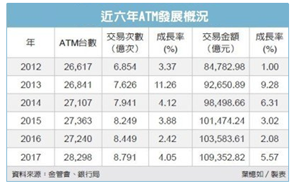 金管會銀行局資料顯示,2004年台灣ATM數量突破2萬台、2007年突破2.5萬台後,成長一度趨緩,但2012年又開始直線上升,一直到2015年來到27,363台後,隔年才出現負成長。