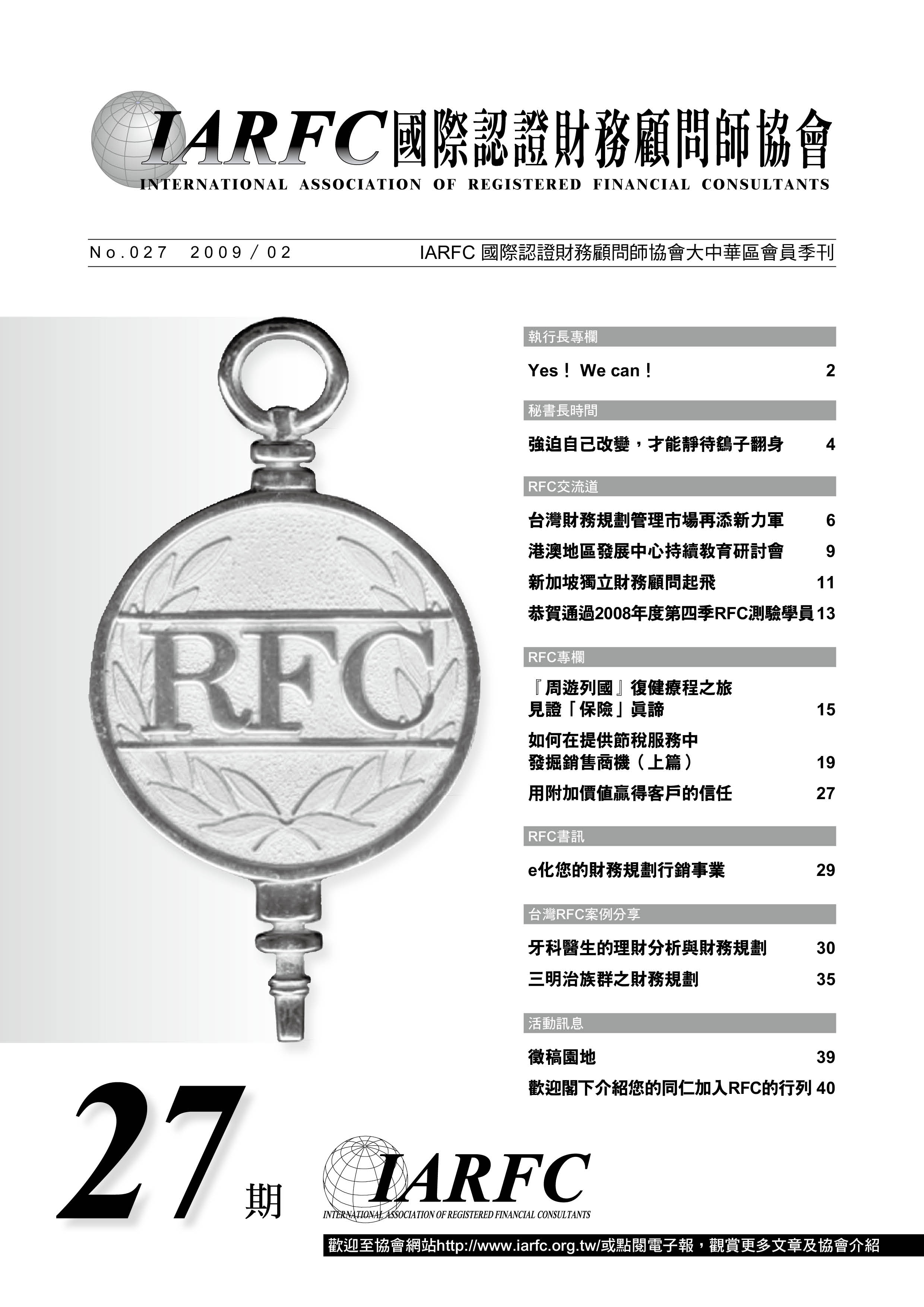 答案肯定是非常清楚的。RFC與保險業務員最大的不同,乃在於我們是站在客戶的制高點上,以顧問的角度清晰臚列出客戶的需求,幫他把關!台灣的財管大餅年增約1兆規模,高資產族群對財管需求是殷切的,只是風暴仍未遠離。蹲下來是為了跳更高,景氣復甦之日,必將是咱RFC再奮起之時。紅極一時的銀行獲利金雞母-財富管理部門收攤走人,而人人稱羨的金融寵兒-理專也被打到趴。我們相信這些事情都會被時間解決,生命總會自己找到出口。此時此刻,我們只不過像極了隧道中的火車,雖然一片漆黑,耐得住,光明與出口就不會太遠。